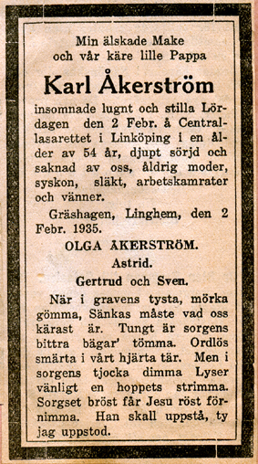 | Åkerström, Karl, banvaktstugan Gräshagen, Linghem | 1935-02-02 | ||