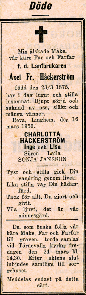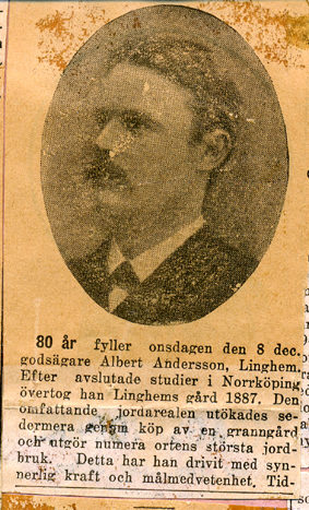 | Andersson, Anders Magnus Albert, patron på Linghems gård. | Ogift | 80 år 1937 | 1942-04-14 |