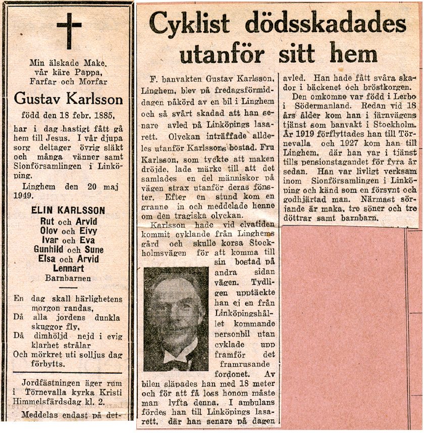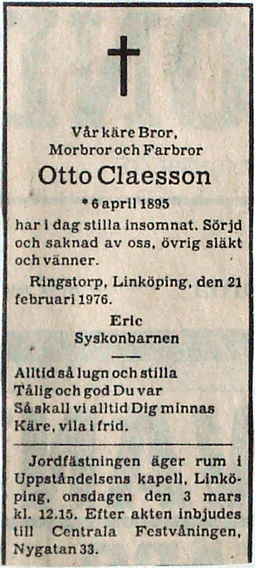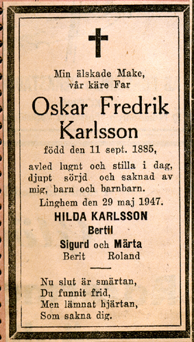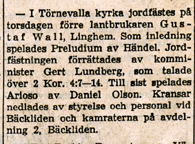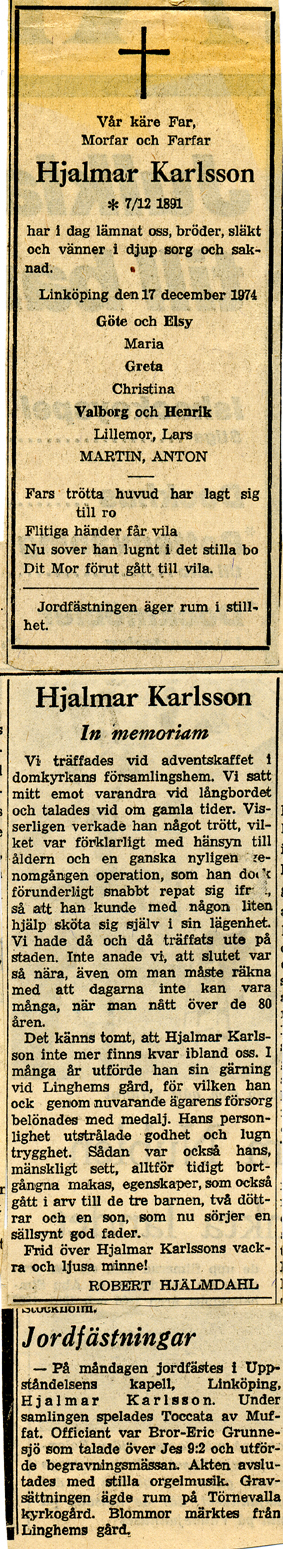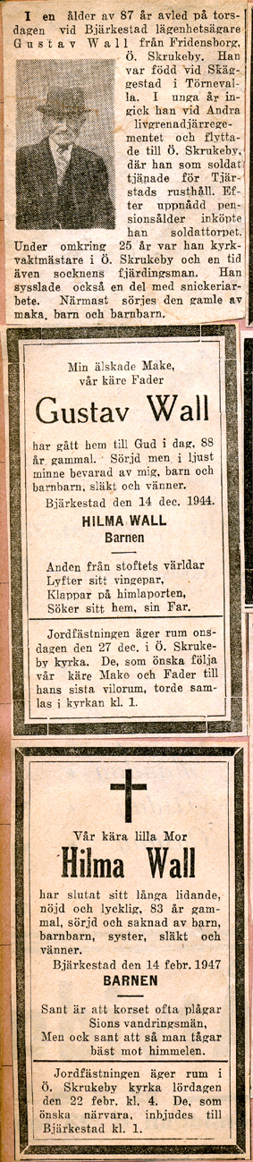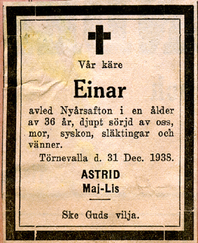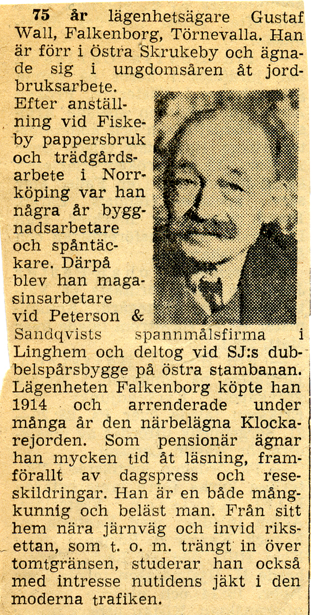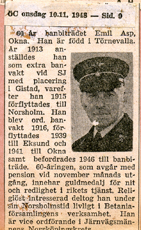 | Asp, Emil, banbiträde född i Törnevalla (Asplund?), troligen svåger till Hilma Wall f. Svensson. | 60 år 1948 | ||