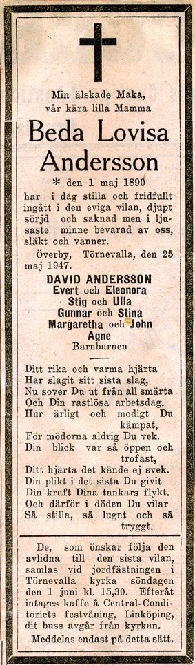 | Andersson, Beda Lovisa, gift med David, Överby | 1947-05-25 | ||