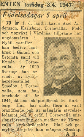 | Andersson, Axel Smedby/Prästgården, sedan Karlsborg. Axel är "gamlebonn i prästgårn", han hade prästgårn på arrende. Han köpte Karlsborg vid Revaövergången när han lämnade prästgården 1944, sönerna Karl-Axel och Gustav övertog den, Gustav var ganska ung då. Axel fick sex barn med Edit, tyvärr dog det första, lilla Britta f 1917. Carl-Axel kom som nummer två, sedan var det Anna-Britta, Ingrid (Inga-Lisa), Gustav och Margareta. Edit dog i barnsäng när Margareta föddes 1924. Då stod Axel ensam med fem små barn, varav Carl-Axel var äldst med sina 6 år och Margareta yngst, 7 dagar! Men han klarade upp att hålla familjen samlad. Prosten Hjälmdahl med familj hjälpte Axel, särskilt med lilla Margareta. Det sägs att de la henne i fetvadd o därefter bredvid kakelugnen för att hon skulle hålla värmen. Sedan kom Anna som hushållerska till Axel, de gifte sig senare och hade det bra ända tills Axels död. |