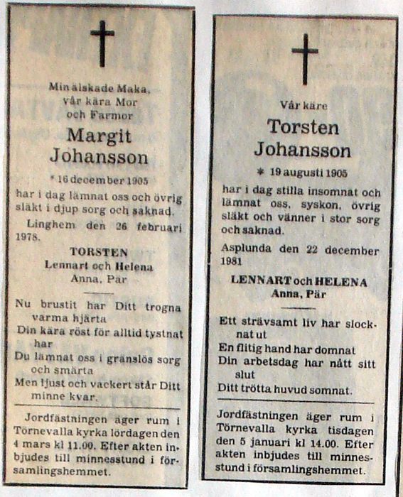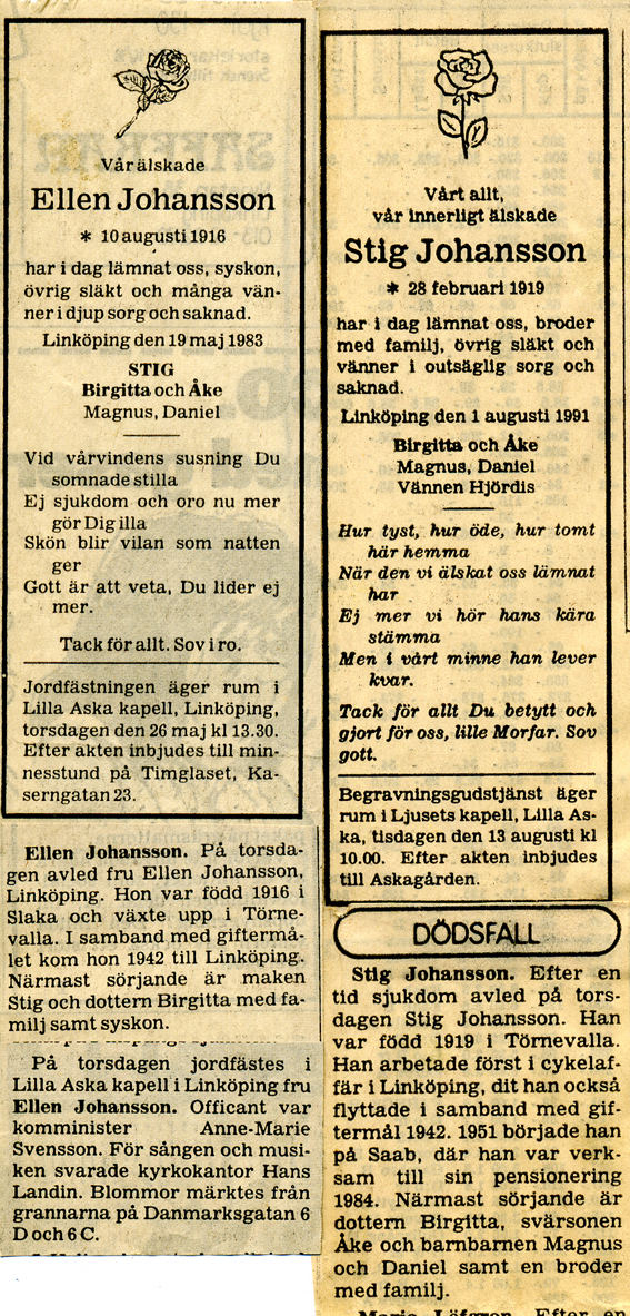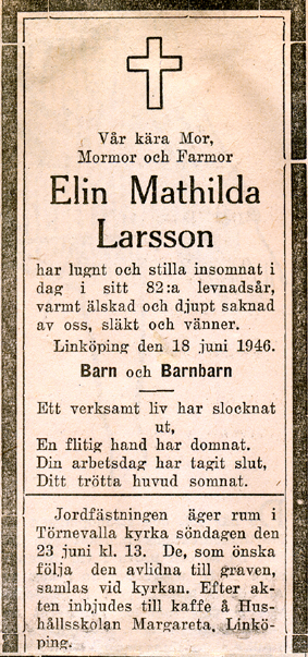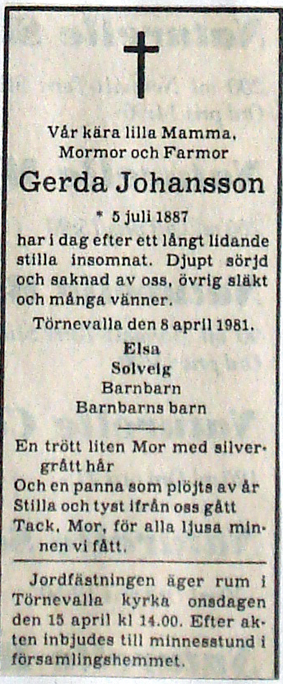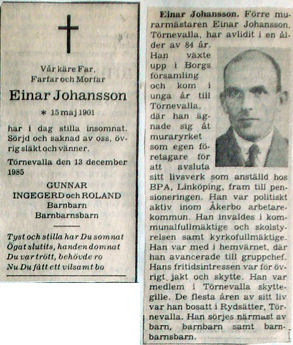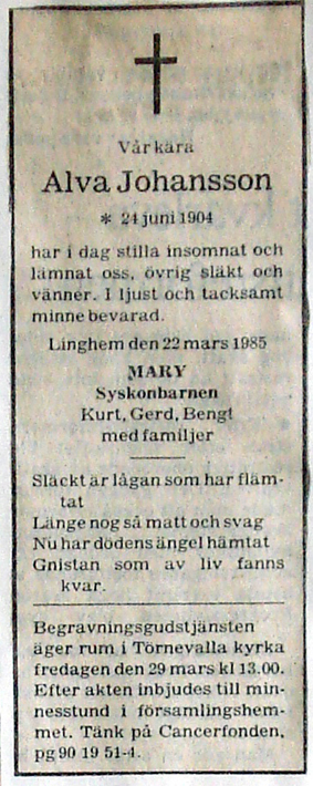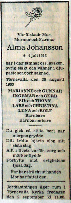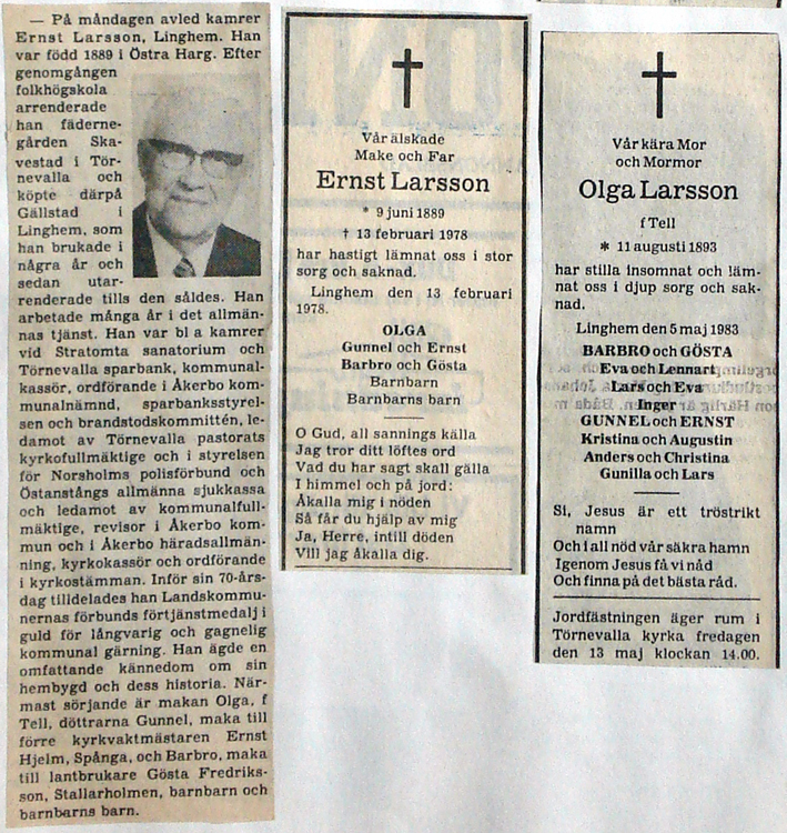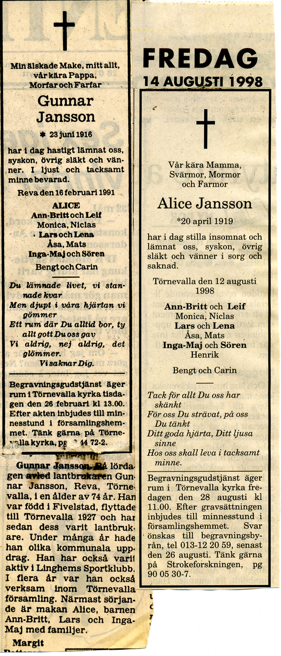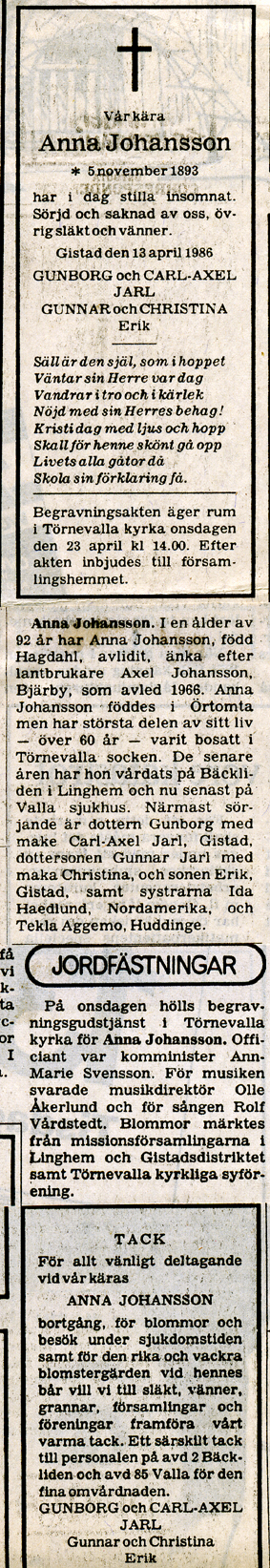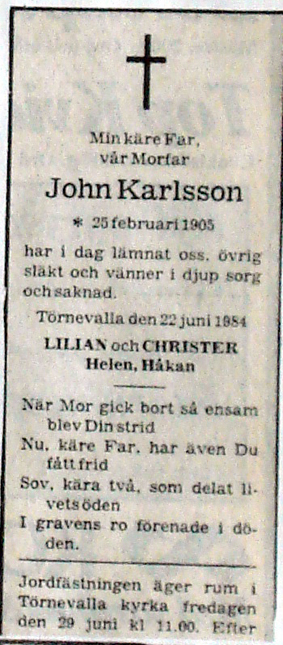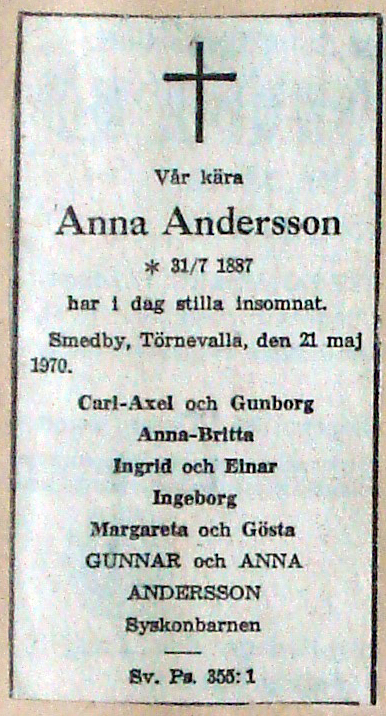 På CD-skivan Sveriges dödbok 1947-2003 räknas det upp 586 avlidna personer födda i Törnevalla församling, 54 av dem avled även i Törnevalla. Jag har inte använt mig av den i den här sammanställningen, utan endast sådant som redan varit officiellt publicerat i tidningar. Skivan kan köpas från Sveriges Släktforskarförbund. Den innhåller enormt mycket intressant information för släktforskare, men inget slår en utförlig dödsruna när man vill veta mera. Därför har jag valt att lägga ut delar av min farmors klippbok på detta sättet och hoppas det kan komma till glädje för de som kartlägger sin släkt.