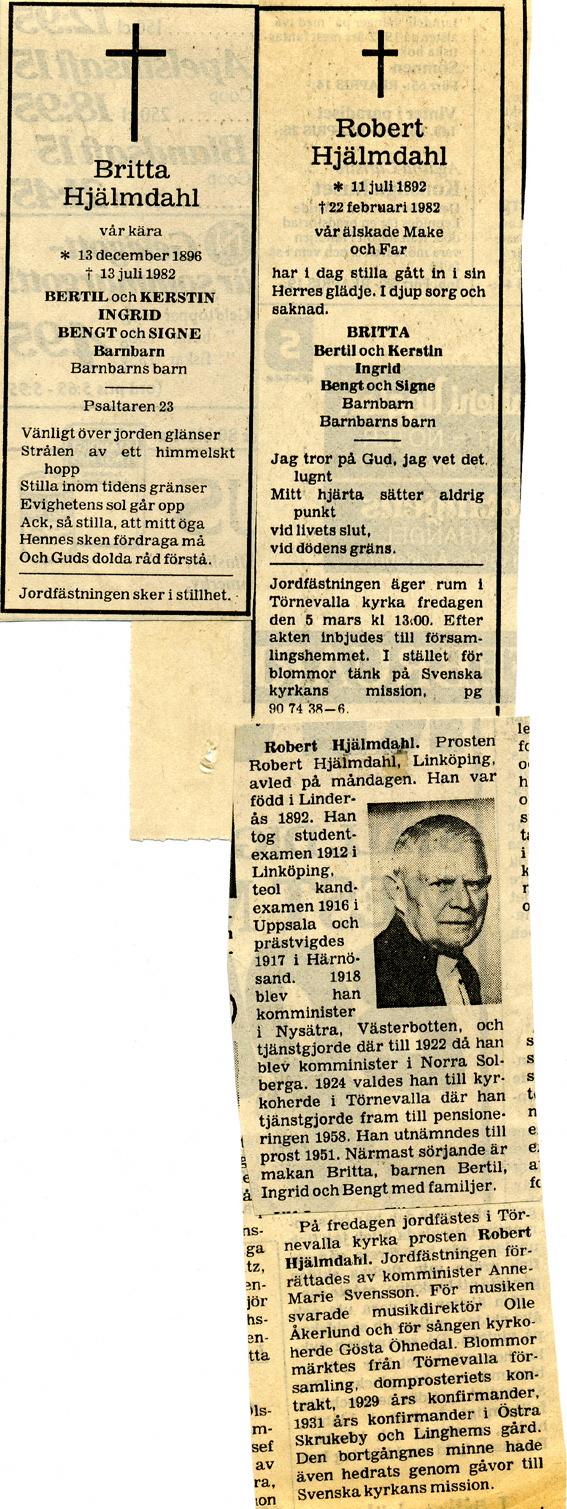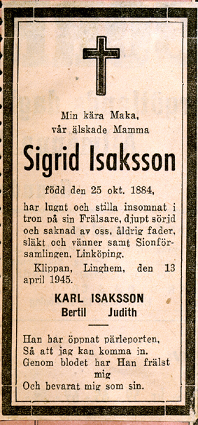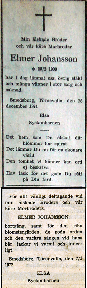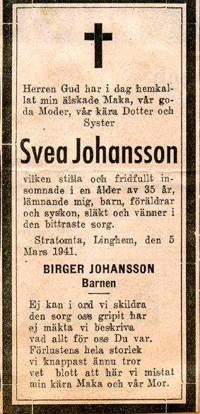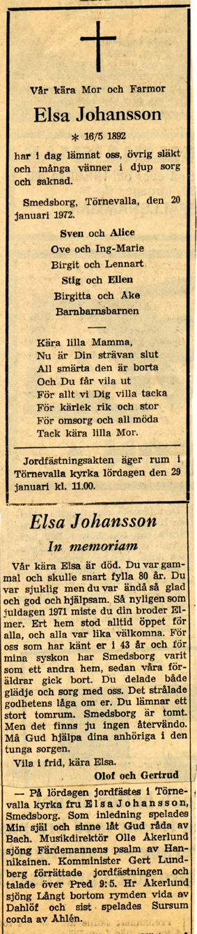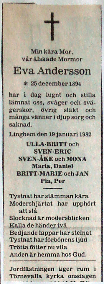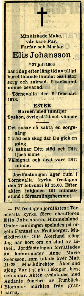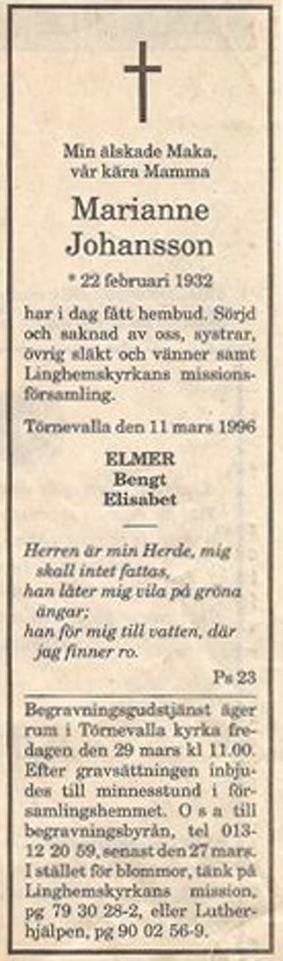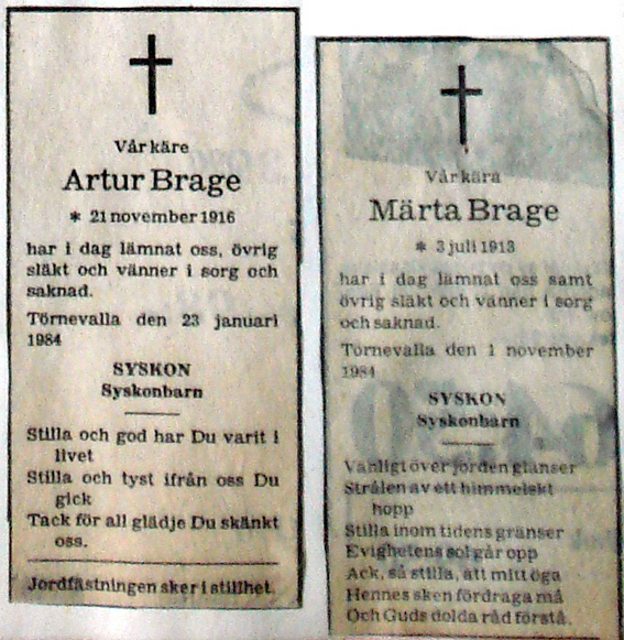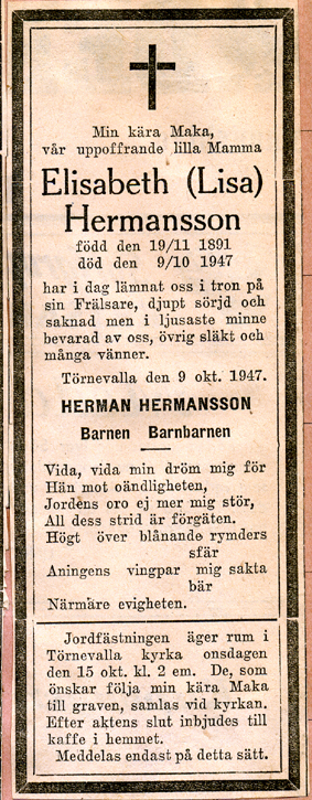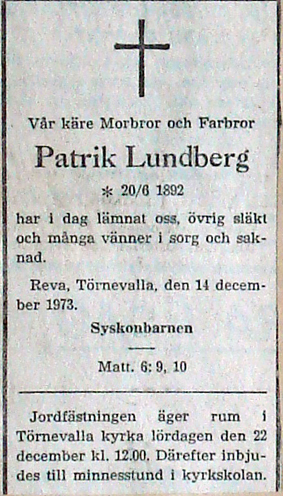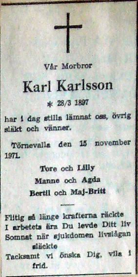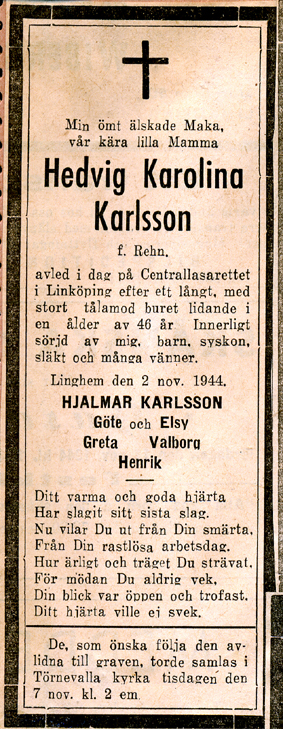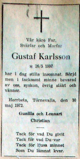 På CD-skivan Sveriges dödbok 1947-2003 räknas det upp 586 avlidna personer födda i Törnevalla församling, 54 av dem avled även i Törnevalla. Jag har inte använt mig av den i den här sammanställningen, utan endast sådant som redan varit officiellt publicerat i tidningar. Skivan kan köpas från Sveriges Släktforskarförbund. Den innhåller enormt mycket intressant information för släktforskare, men inget slår en utförlig dödsruna när man vill veta mera. Därför har jag valt att lägga ut delar av min farmors klippbok på detta sättet och hoppas det kan komma till glädje för de som kartlägger sin släkt.