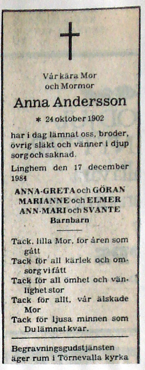| Andersson, Maria, Linghem | 85 år 1985 | ||