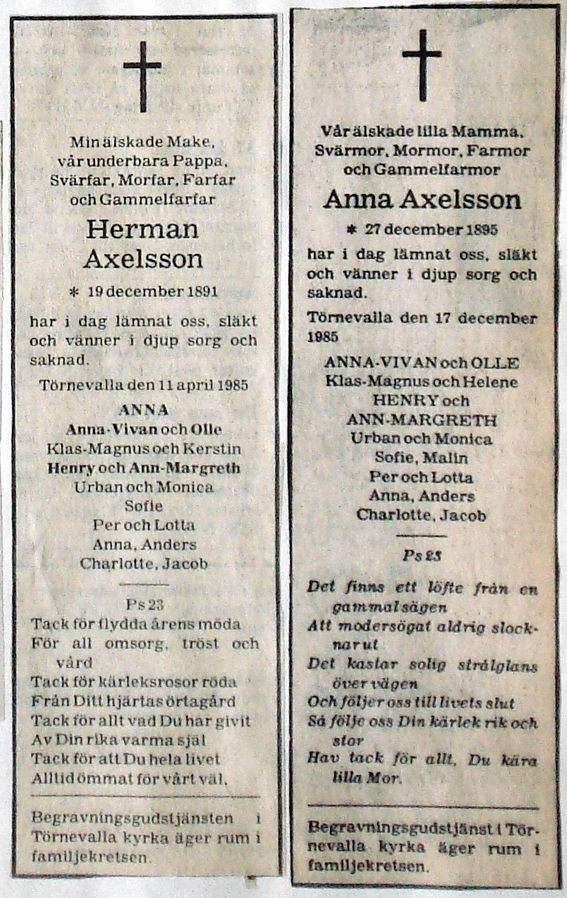 | Axelsson, Anna, gift med Herman, Törnevalla | 1985-12-17 | ||