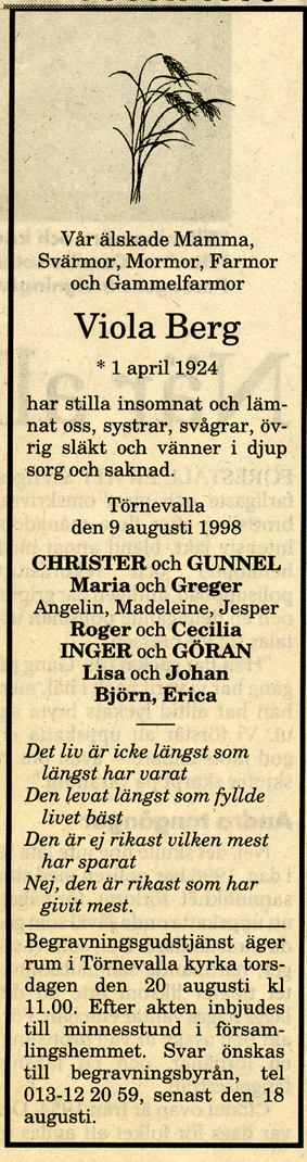 | Berg, Viola, gift med Alfred, Törnevalla | 1998-08-09 | ||