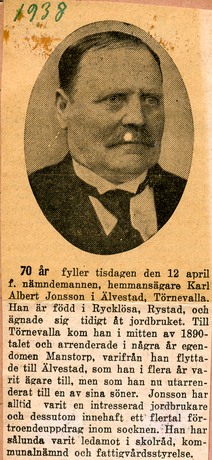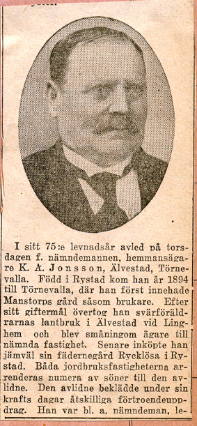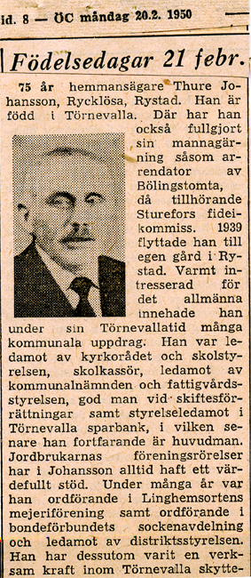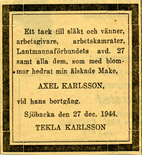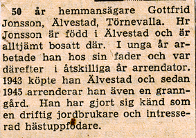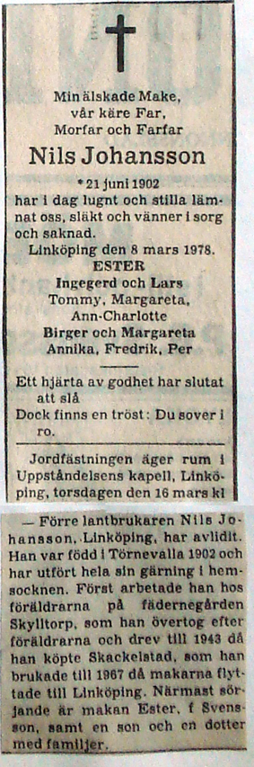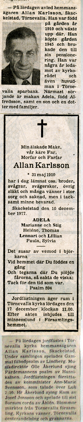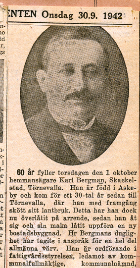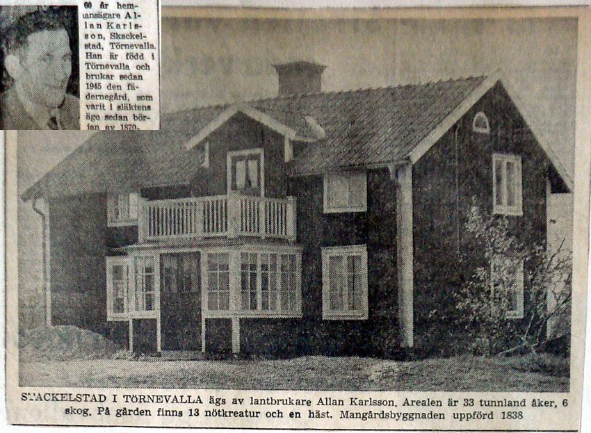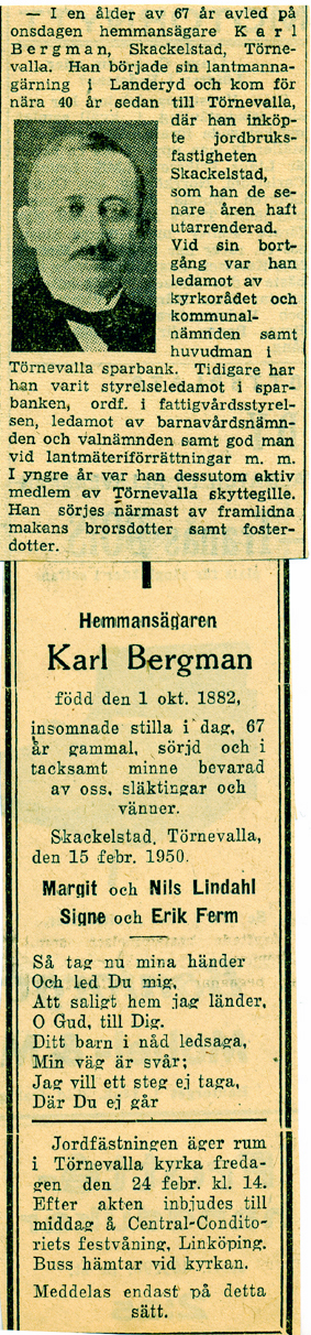 | Bergman, Karl, gift med Johanna Vilhelmina, Skackelstad. Han sålde till en släkting. Sen kom "Karl-Axel i prästgårn". Sen kom Elmer Johansson och nu hans son Bengt. | 60 år 1942 | 1950-02-15 | |