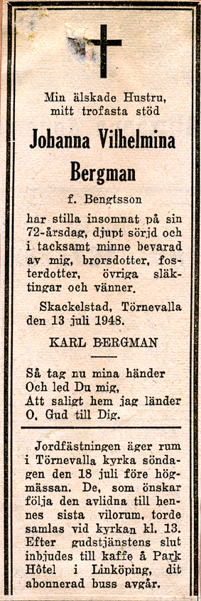 | Bergman, Johanna Vilhelmina, Skackelstad | 1948-07-13 | ||