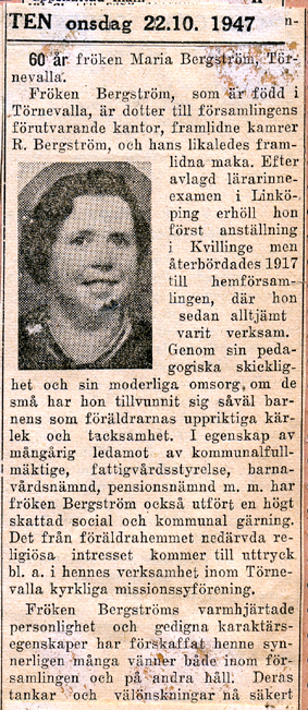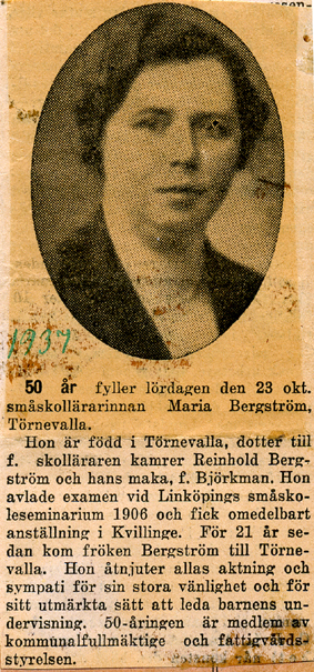 | Bergström, Maria "Ia", lärare i Törnevalla, dotter till Matilda. Bodde i Klintorp och i lärarbostaden. | Ogift | 50 år 1937 60 år 1947 |