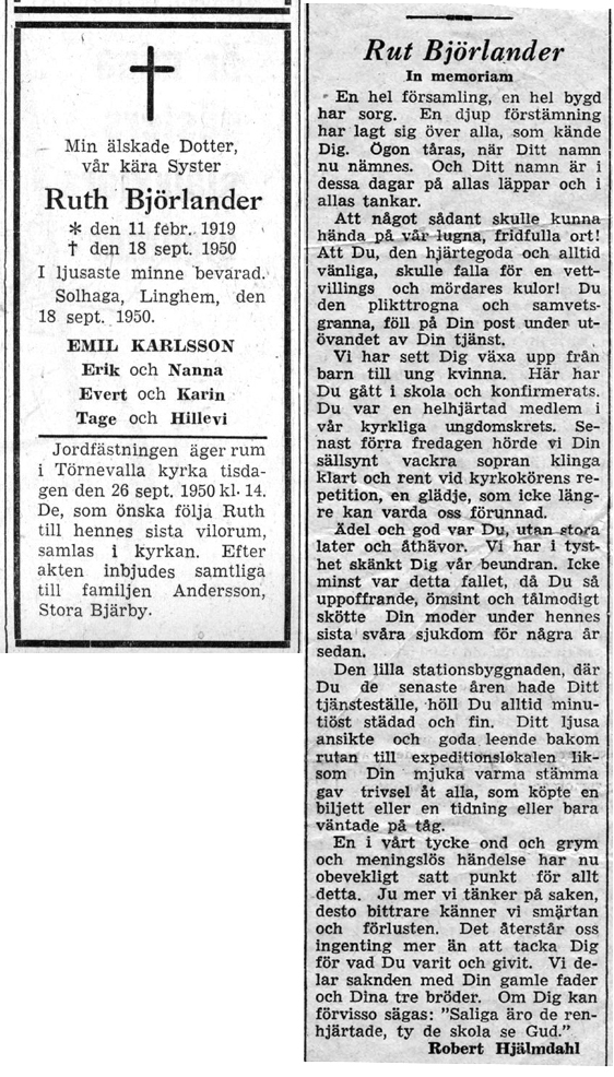 | Björlander, Ruth, dotter till Emil Karlsson Solhaga, Bjärby. Mördad. | 1950-09-21 | ||