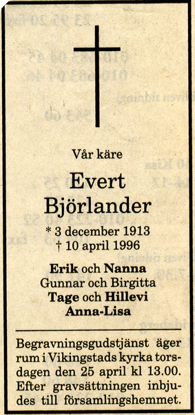 | Björlander, Evert, son till Emil Karlsson Solhaga, Bjärby | 1996-04-10 | ||