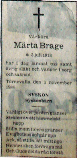 | Brage, Märta, dotter till Elisabet, Törnevalla | 1984-11-01 | ||