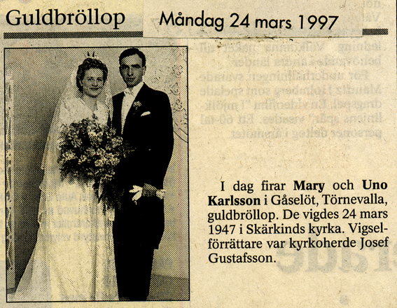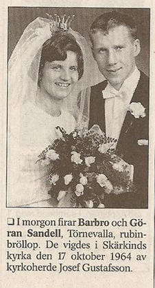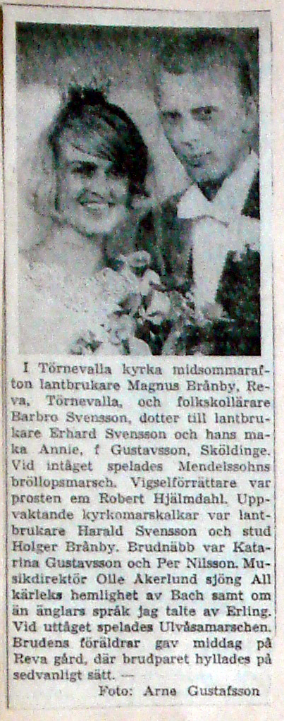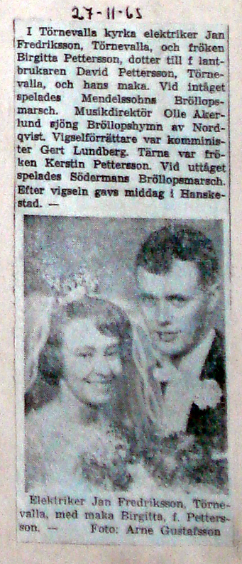 | Fredriksson, Jan, Skogstorp, Reva, (sonson till Maria Lovisa) med hustru Birgitta Pettersson, dotter till David och Anna Pettersson, Solhaga, Bjärby | 1965 | ||