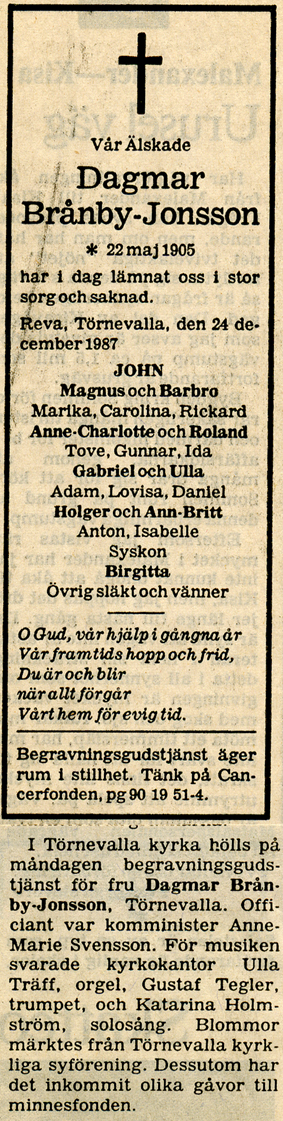 | Brånby-Jonsson, Dagmar, lärare, Reva, mor till Gabriel och Magnus. | 1987-12-24 | ||