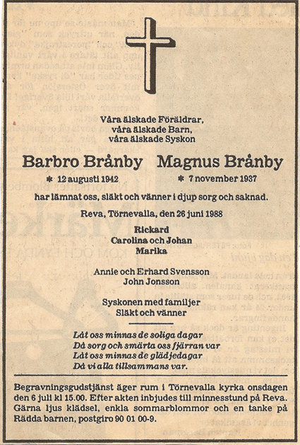 | Brånby, Magnus, Reva, med maka Barbro Svensson. Omkom vid tågkrock. | 1966 | 1988-06-26 | |