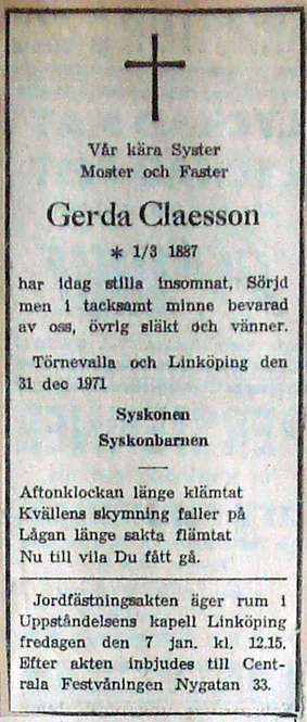| Claesson, Gerda, Himmelslund. Bodde med syskonen Kalle, Gustaf, David och Maria | 1971-12-31 | ||