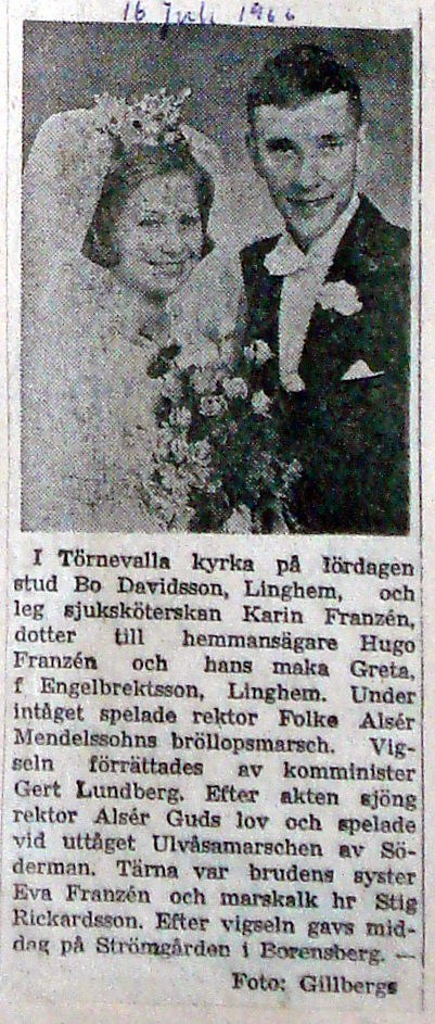 | Davidsson, Bo med hustru Karin Franzén, dotter till Hugo och Greta Franzén Stratomta. | 1966 | ||