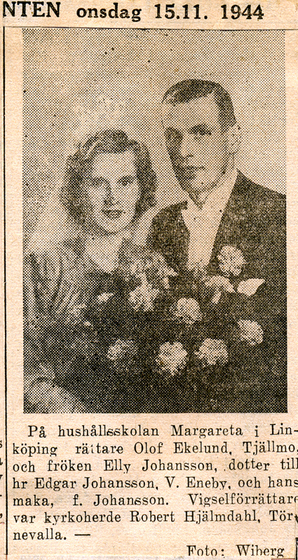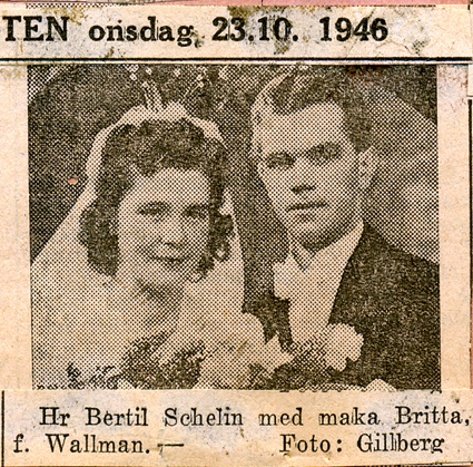 | Schelin, Bertil med maka Britta Wallman. Fader Schelin var snickare, bodde i Nysäter mitt emot Törnevalla skola. Byggde vid Linghems gård, och flyttade dit, men dom husen revs när vägen byggdes om. Det var fardern som byggde Sméns Smedsborg. Britta var dotter till Märta Viking i Holmedal. | 1946 | ||