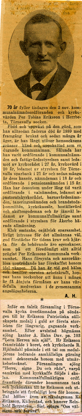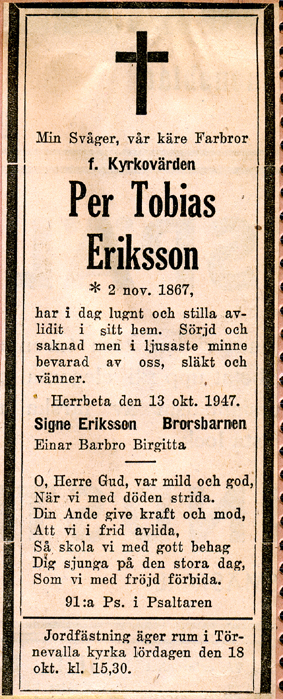 | Eriksson, Per Tobias, Herrbeta, var nån kommunalman så han hade alla möjliga uppdrag. Dom som skulle ha fattigvård fick gå till Per i Herrbeta, snål och gniden var han. | 70 år 1937 | 1947-10-13 | |