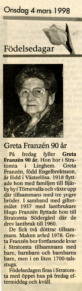 | Franzén, Greta, gift med Hugo, Stratomta, föräldrar till Karin g. Davidsson | 90 år 1998 | ||