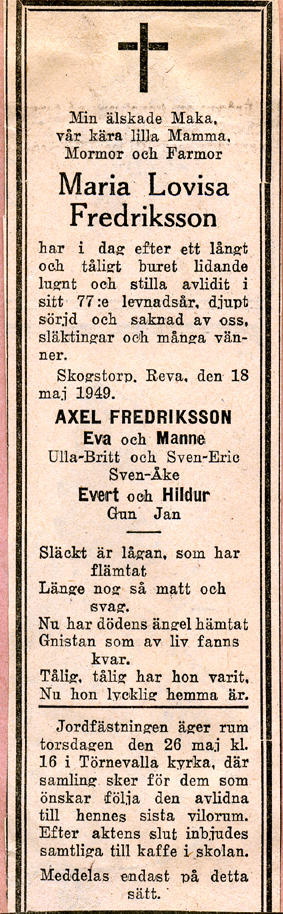 | Fredriksson, Maria Lovisa, Skogstorp, Reva, farmor till Jan Fredriksson | 1949-05-18 | ||