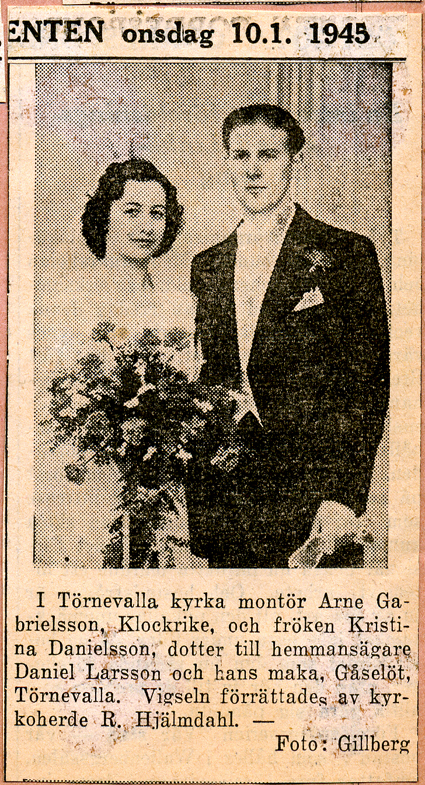 | Gabrielsson, Arne, montör, Klockrike med maka Kristina Danielsson, dotter till hemmansägare Daniel Larsson, Gåselöt. | 1945 | ||