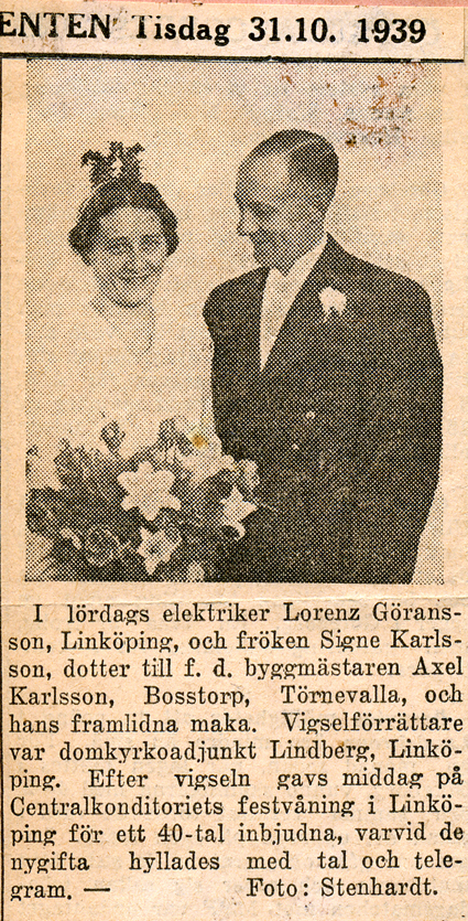 | Göransson, Lorents, Linköping med maka Signe Karlsson, dotter till Axel Karlsson, Bosstorp, Törnevalla. | 1939 | ||