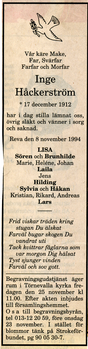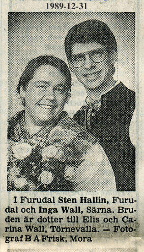 | Wall, Inga med make Sten Hallin. Webbsnickaren i Särna! Dotter till Elis och Carin. | 1989 | ||