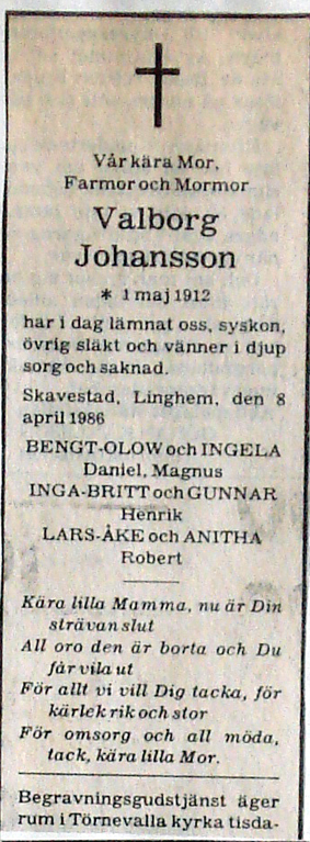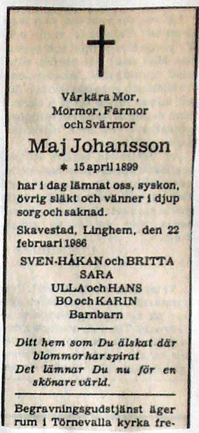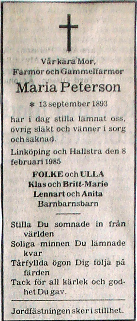 | Petersson, Maria, Hallstra, gift med Gunnar, mor till Folke | 1985-02-08 | ||