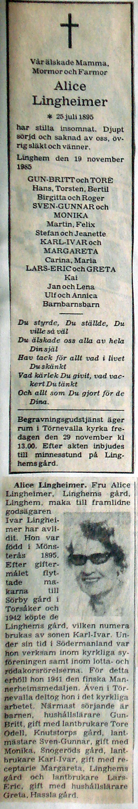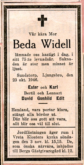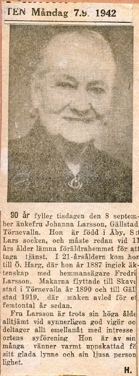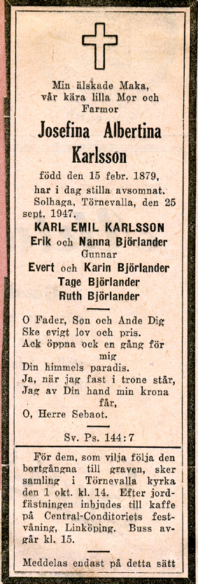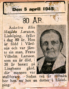 | Hagström, Matilda, Linghem, mor till Albin, bodde vid korsningen Askeby/Vårdsberg | 1949-07-11 | ||