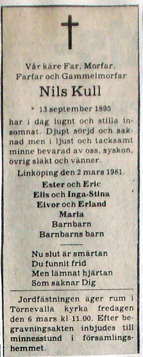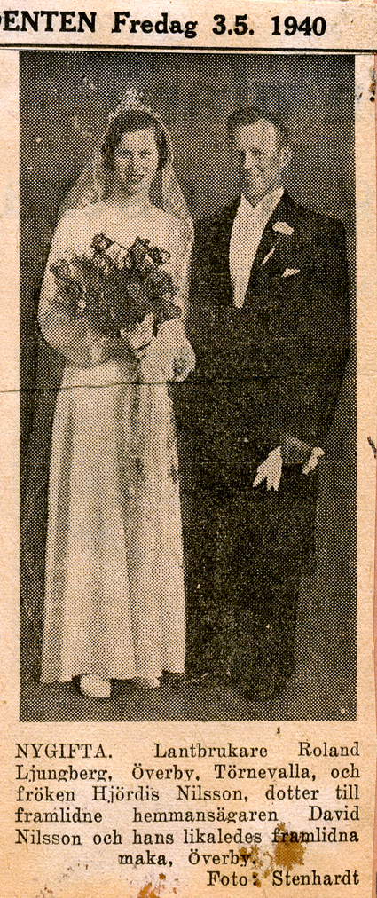 | Ljungberg, Roland, Överby, Törnevalla, med maka Hjördis Nilsson, dotter David Nilsson, Överby. (David Nilsson var bror med Albin Nilsson i Reva.) | 1940 | 1994-12-28 | |