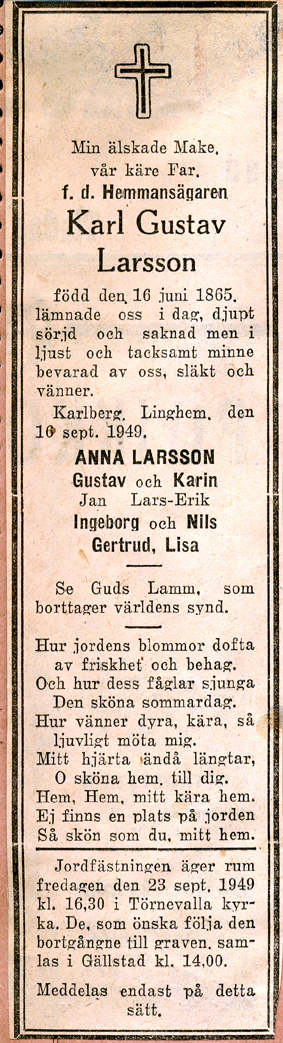 | Larsson, Karl Gustav, Karlberg, Linghem | 1949-09-16 | ||