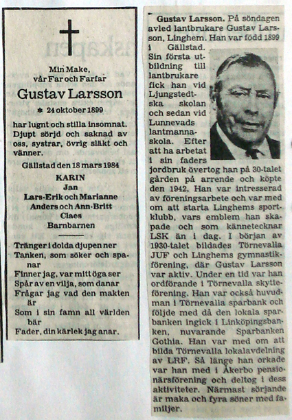 | Larsson, Gustav, Gällstad, med hustru Karin Magnusson. | 1942 | 1984-03-18 | |
