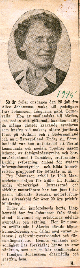 | Lingheimer/Johansson, Alice, husfru Linghems gård, gift med Ivar | Guld 1971 | 50 år 1945 | 1985-11-19 |