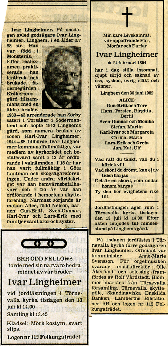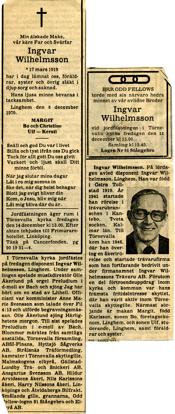 | Wilhelmsson, Ingvar, Linghem, disponent Wilhelmssons Trävaru = sågen i Linghem. Far till Leif | 1979-12-08 | ||