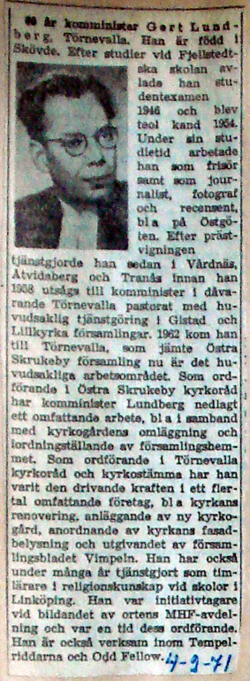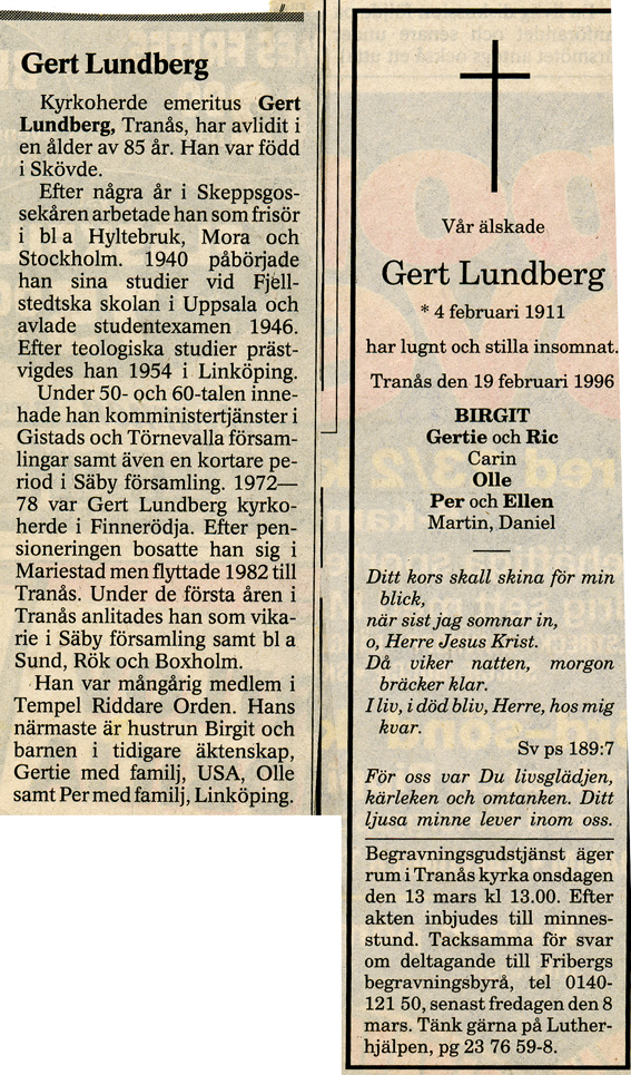 | Lundberg, Gert, kyrkoherde i Törnevalla | 60 år 1971 | 1996-02-19 | |