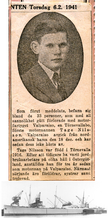 | Nilsson, Tage, Törnevalla, omkom då fartyget Valparaiso torpederades av tysk ubåt. | 1940-12-31 | ||