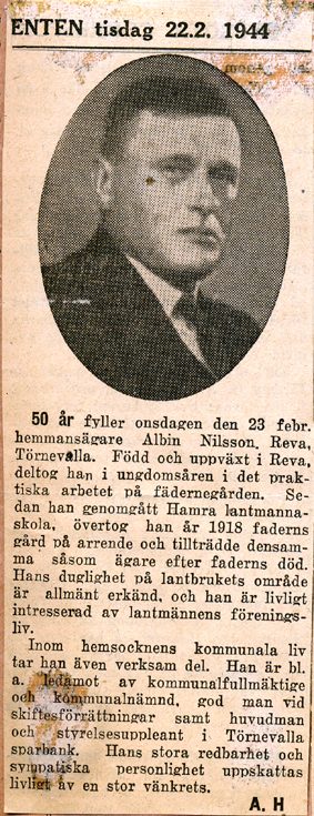 | Nilsson, Albin, Reva, gift med Elin, svärfar till Gunnar Jansson | 50 år 1944 | ||