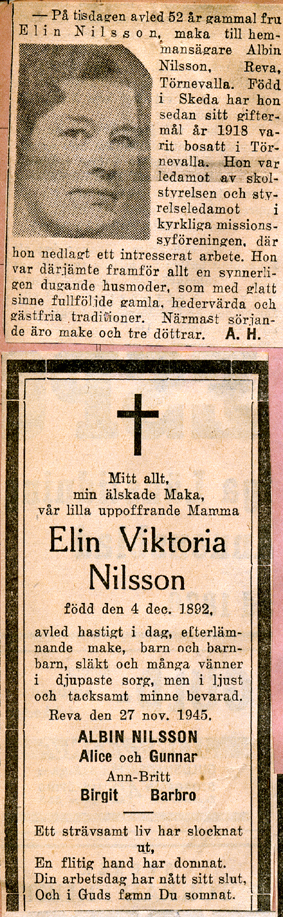 | Nilsson, Elin Viktoria, Reva, svärmor till Gunnar Jansson | 1945-11-27 | ||