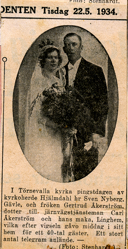 | Nyberg, Sven, Gävle med maka Gertrud Åkerström, doter till järnvägstjänsteman Carl Åkerström, Linghem. Åkerströms bodde i Gräshagen. | 1934 | ||