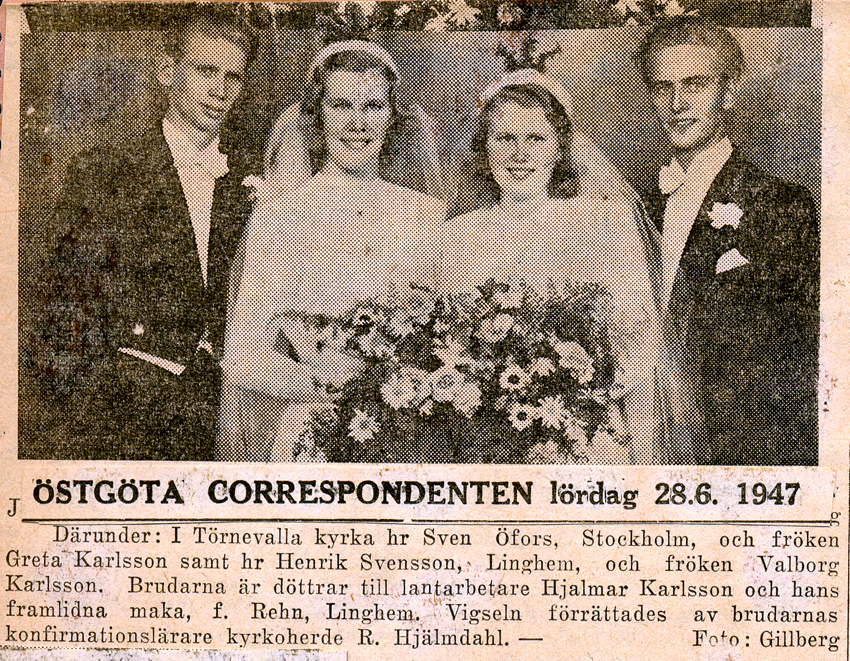 | Öfors, Sven Stockholm och Greta Karlsson, Linghem. Dubbelbröllop med Henrik Svensson och Valborg Karlsson. Brudarna är döttrar till lantarbetare Hjalmar Karlsson, Linghems gård. Polisman Göte Karlsson i Askeby var en bror, född 1920, han dog hastigt. | 1947 | ||