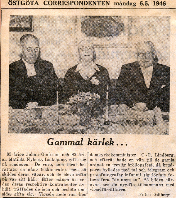 | Olofsson, Johan med maka Matilda Nyberg, Linköping. 85 och 82 år vid vigseln. | 1946 | ||