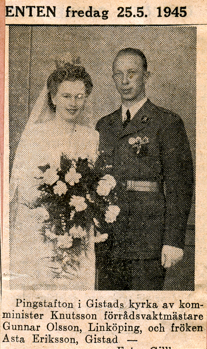 | Olsson, Gunnar Linköping med maka Asta Eriksson, Gistad. Gunnar är född i Gistad, strax intill Lillkyrkavägen. | 1945 | ||