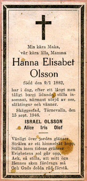 | Olsson, Hanna Elisabet, Skäggestad | 1946-09-15 | ||