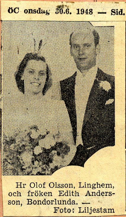 | Olsson, Olof "Olle" med maka Edith Andersson. Olle i Skäggestad, son till Israel och Hanna Elisabet Olsson. | 1948 | ||