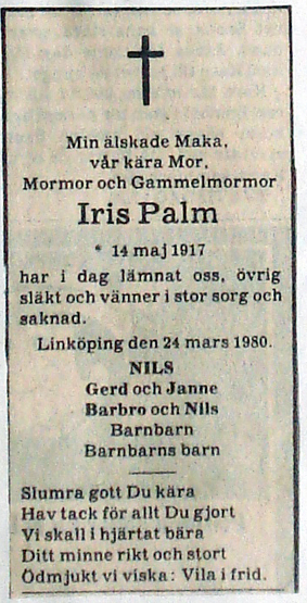 | Palm, Iris, gift med Nils Palm från Tärnestad | 1980-03-24 | ||