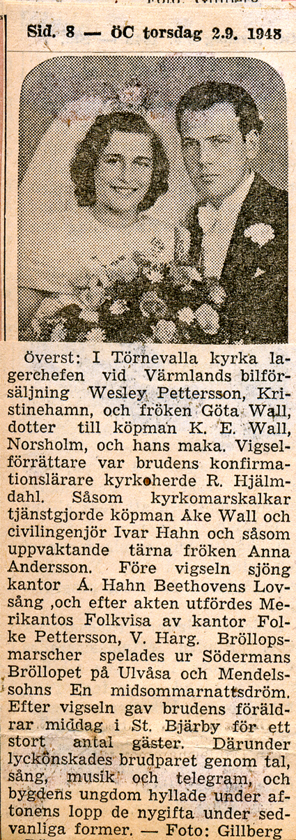 | Pettersson, Wesley, Kristinehamn med maka Göta Wall, dotter till köpman K. E. Wall (då i Norsholm). | 1948 | ||