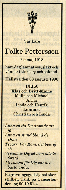 | Pettersson, Folke, Hallstra, son till Maria | 1996-08-30 | ||