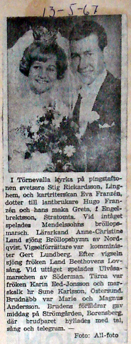 | Rickardsson, Stig, Linghem med maka Eva Franzén, dotter till Hugo och Greta Franzén, Stratomta | 1967 | ||