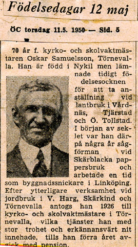 | Samuelsson, Oskar, kyrko- och skolvaktmästare i Törnevalla | 70 år 1950 | ||